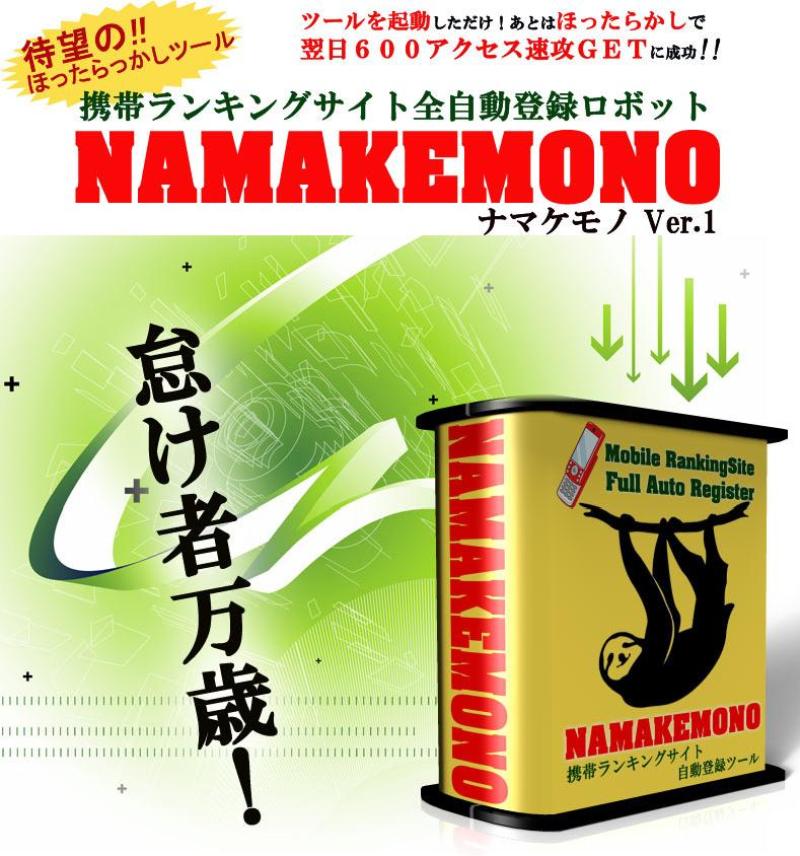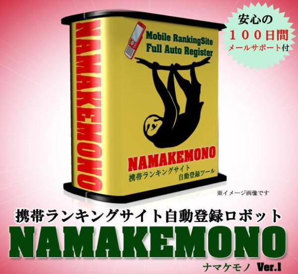 ⇒特典付き「携帯ランキングサイト完全自動登録ロボット『NAMAKEMONO〜ナマケモノ』」の詳細はこちら!